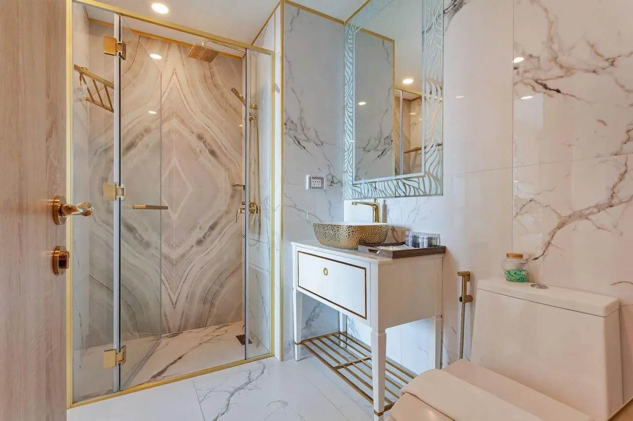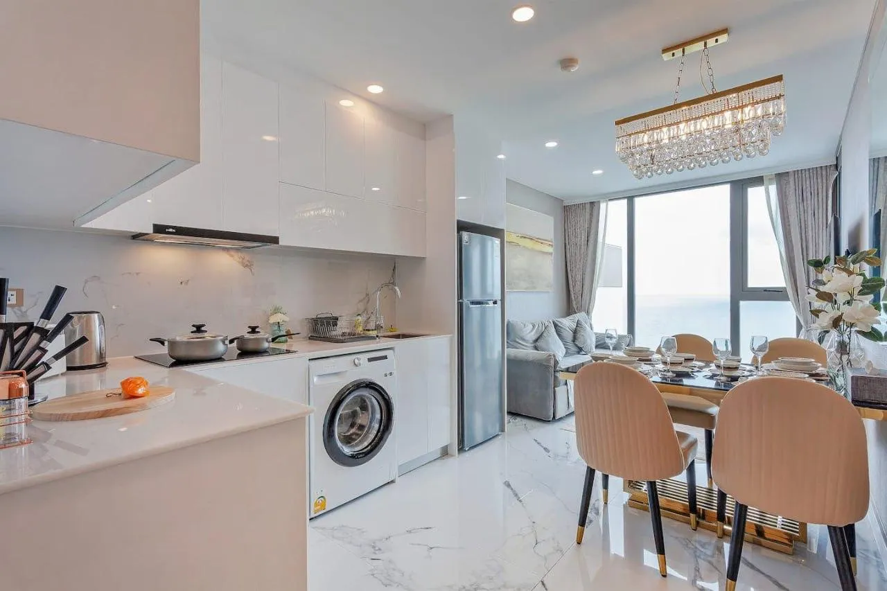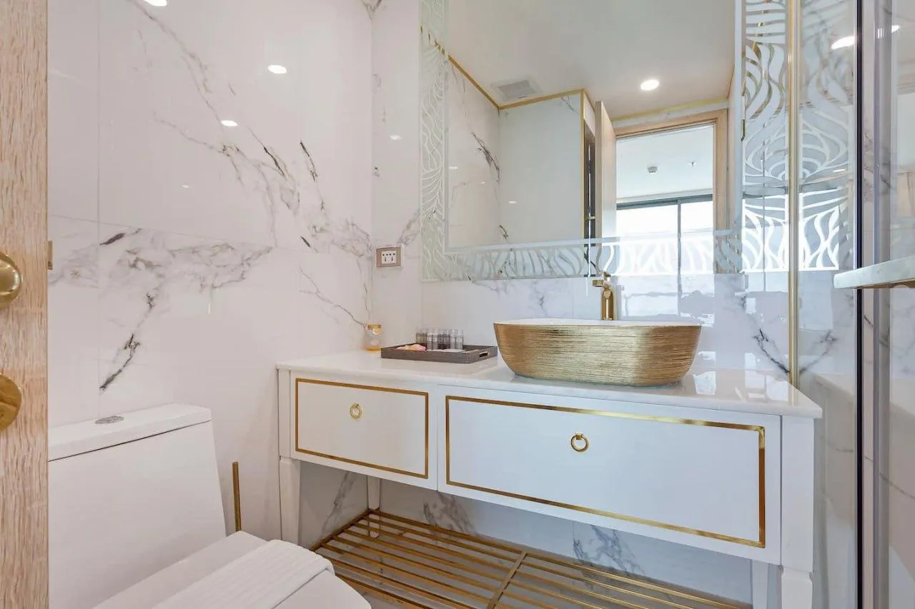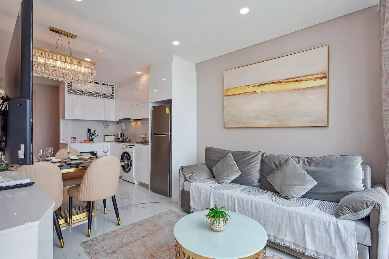 Современная квартира с 2 кроватями и 2 ванными комнатами (1 кровать размера King size, 1 кровать размера Queen size и 1 диван-кровать).